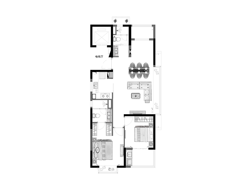 全明户型,三开间双卧南向;双阳台双卫浴;客餐厅一体化设计、L型厨房空间;创新X空间;