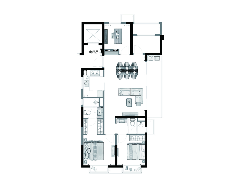 东边套户型,南北采光通透;客餐厅一体化,连接约6 .3米宽横厅;北向创新X空间;